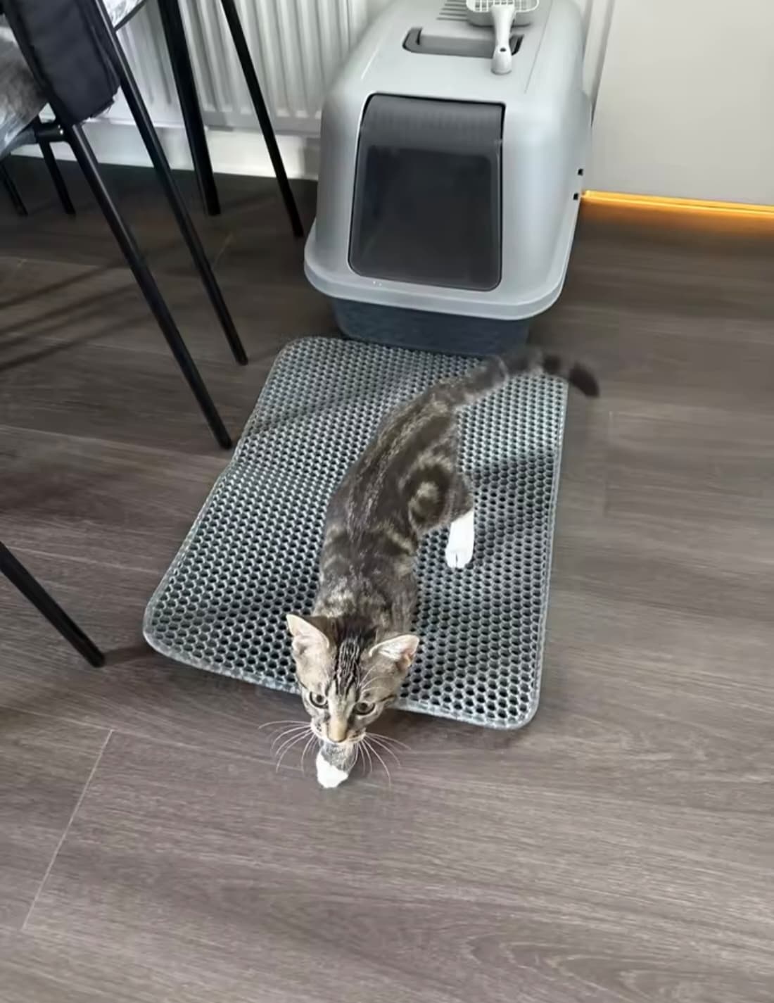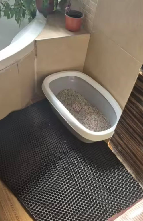 Le tapis Felinou retient efficacement les grains de litière grâce à sa texture alvéolée innovante, tout en apportant douceur et confort à chaque pas.